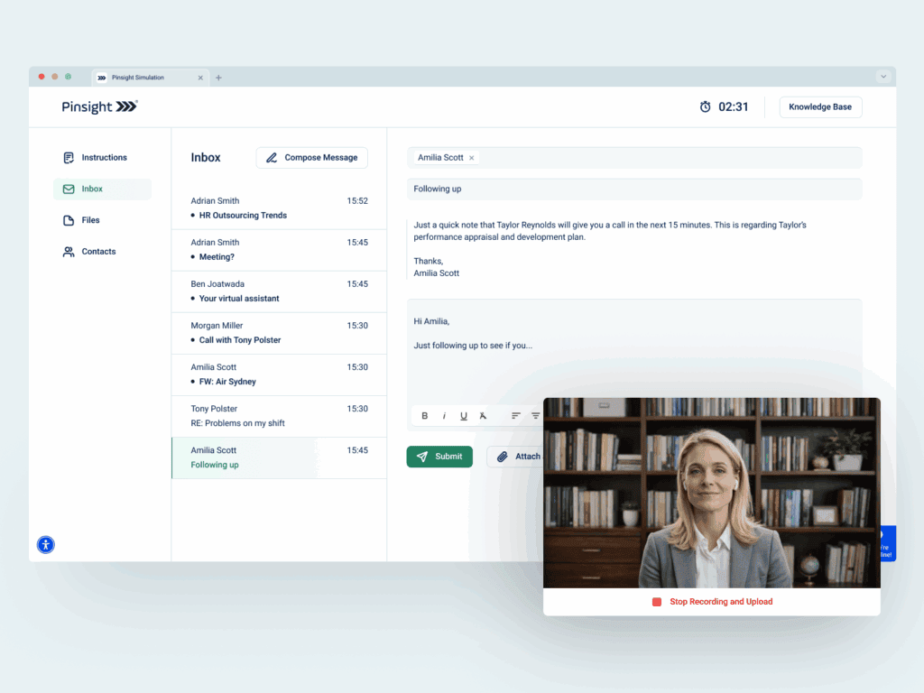 - Engage in live webcam meetings with trained role-players—professional assessors who portray colleagues, direct reports, or stakeholders.