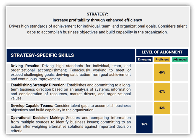 Next, review the Strategy-Specific Skills section. This translates behavioral data from realistic leadership simulations into actionable insight about skills and readiness to deliver on your organization’s top priorities—whether that’s driving transformation, building alignment, or executing growth strategies. You’ll immediately see which skills are strong and where development may be needed.